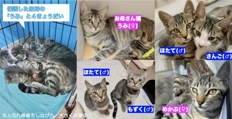 最近では、元野良猫の母猫「うみ」とその子猫4匹を預かりボランティアとして受け入れています。
